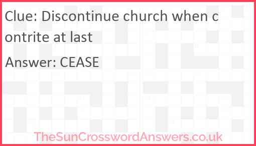 Discontinue church when contrite at last is a crossword clue for which we have 1 possible answer and we have spotted 2 times in our database. This crossword clue was last seen on 15 October 2022 in The Sun Cryptic Crossword puzzle!