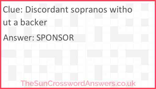 Discordant sopranos without a backer is a crossword clue for which we have 1 possible answer and we have spotted 3 times in our database. This crossword clue was last seen on 19 March 2024 in The Sun Cryptic Crossword puzzle!