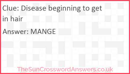 Disease beginning to get in hair is a crossword clue for which we have 1 possible answer and we have spotted 1 times in our database. This crossword clue was last seen on 05 June 2019 in The Sun Cryptic Crossword puzzle!
