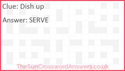Dish up is a crossword clue for which we have 1 possible answer and we have spotted 7 times in our database. This crossword clue was last seen on 25 September 2024 in The Sun Coffee Time Crossword puzzle!