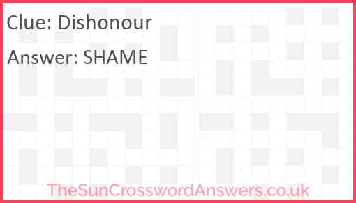 Dishonour is a crossword clue for which we have 1 possible answer and we have spotted 6 times in our database. This crossword clue was last seen on 26 November 2024 in The Sun Coffee Time Crossword puzzle!