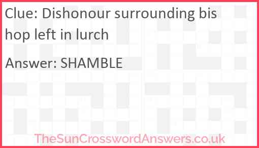 Dishonour surrounding bishop left in lurch is a crossword clue for which we have 1 possible answer and we have spotted 1 times in our database. This crossword clue was last seen on 31 October 2024 in The Sun Cryptic Crossword puzzle!