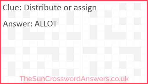 Distribute or assign is a crossword clue for which we have 1 possible answer and we have spotted 2 times in our database. This crossword clue was last seen on 25 June 2019 in The Sun Coffee Time Crossword puzzle!