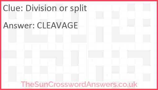 Division or split is a crossword clue for which we have 1 possible answer and we have spotted 2 times in our database. This crossword clue was last seen on 23 November 2020 in The Sun Coffee Time Crossword puzzle!