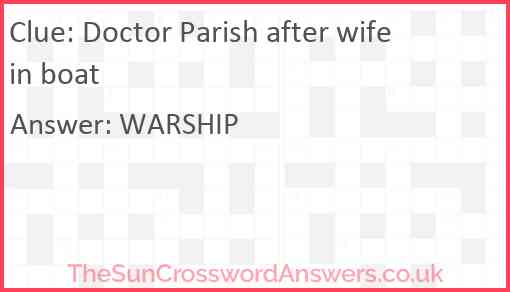 Doctor Parish after wife in boat is a crossword clue for which we have 1 possible answer and we have spotted 2 times in our database. This crossword clue was last seen on 15 May 2022 in The Sun Cryptic Crossword puzzle!