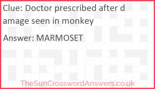 Doctor prescribed after damage seen in monkey is a crossword clue for which we have 1 possible answer and we have spotted 1 times in our database. This crossword clue was last seen on 20 February 2023 in The Sun Cryptic Crossword puzzle!