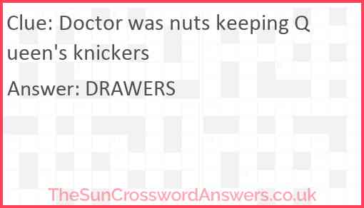 Doctor was nuts keeping Queen's knickers is a crossword clue for which we have 1 possible answer and we have spotted 1 times in our database. This crossword clue was last seen on 21 March 2024 in The Sun Cryptic Crossword puzzle!