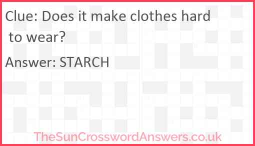Does it make clothes hard to wear? is a crossword clue for which we have 1 possible answer and we have spotted 2 times in our database. This crossword clue was last seen on 28 May 2024 in The Sun Cryptic Crossword puzzle!