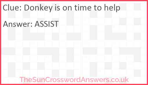 Donkey is on time to help is a crossword clue for which we have 1 possible answer and we have spotted 3 times in our database. This crossword clue was last seen on 08 December 2024 in The Sun Cryptic Crossword puzzle!