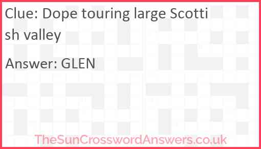 Dope touring large Scottish valley is a crossword clue for which we have 1 possible answer and we have spotted 1 times in our database. This crossword clue was last seen on 05 September 2021 in The Sun Cryptic Crossword puzzle!