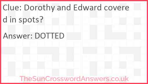 Dorothy and Edward covered in spots? is a crossword clue for which we have 1 possible answer and we have spotted 1 times in our database. This crossword clue was last seen on 06 March 2023 in The Sun Cryptic Crossword puzzle!