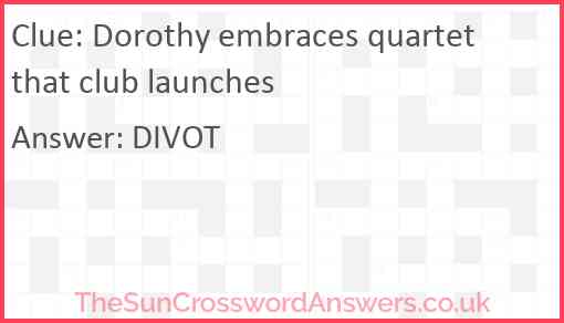 Dorothy embraces quartet that club launches is a crossword clue for which we have 1 possible answer and we have spotted 1 times in our database. This crossword clue was last seen on 25 March 2023 in The Sun Cryptic Crossword puzzle!