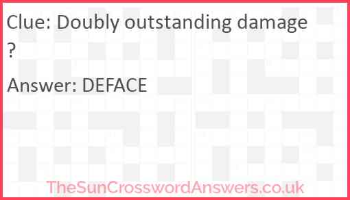 Doubly outstanding damage? is a crossword clue for which we have 1 possible answer and we have spotted 2 times in our database. This crossword clue was last seen on 31 July 2024 in The Sun Cryptic Crossword puzzle!