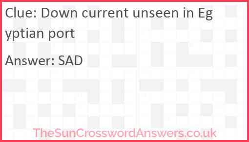 Down current unseen in Egyptian port is a crossword clue for which we have 1 possible answer and we have spotted 1 times in our database. This crossword clue was last seen on 01 May 2024 in The Sun Cryptic Crossword puzzle!
