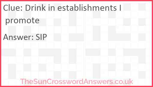Drink in establishments I promote is a crossword clue for which we have 1 possible answer and we have spotted 2 times in our database. This crossword clue was last seen on 17 September 2023 in The Sun Cryptic Crossword puzzle!
