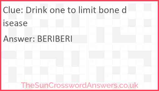 Drink one to limit bone disease is a crossword clue for which we have 1 possible answer and we have spotted 2 times in our database. This crossword clue was last seen on 20 February 2024 in The Sun Cryptic Crossword puzzle!