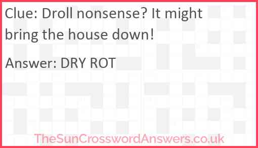 Droll nonsense? It might bring the house down! is a crossword clue for which we have 2 possible answer and we have spotted 2 times in our database. This crossword clue was last seen on 06 May 2023 in The Sun Cryptic Crossword puzzle!