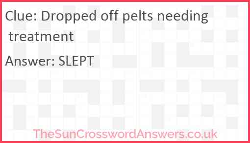 Dropped off pelts needing treatment is a crossword clue for which we have 1 possible answer and we have spotted 1 times in our database. This crossword clue was last seen on 21 October 2024 in The Sun Cryptic Crossword puzzle!