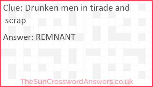 Drunken men in tirade and scrap is a crossword clue for which we have 1 possible answer and we have spotted 3 times in our database. This crossword clue was last seen on 18 January 2025 in The Sun Cryptic Crossword puzzle!