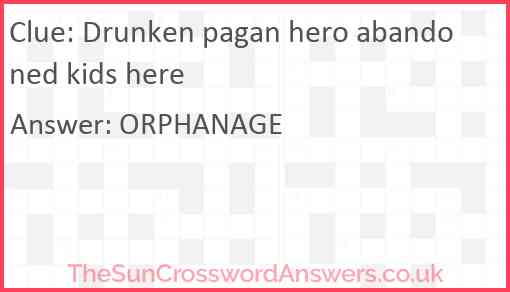 Drunken pagan hero abandoned kids here is a crossword clue for which we have 1 possible answer and we have spotted 1 times in our database. This crossword clue was last seen on 24 May 2020 in The Sun Cryptic Crossword puzzle!