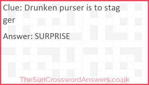 Drunken purser is to stagger is a crossword clue for which we have 1 possible answer and we have spotted 2 times in our database. This crossword clue was last seen on 29 October 2024 in The Sun Cryptic Crossword puzzle!
