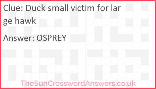 Duck small victim for large hawk is a crossword clue for which we have 1 possible answer and we have spotted 1 times in our database. This crossword clue was last seen on 27 November 2021 in The Sun Cryptic Crossword puzzle!