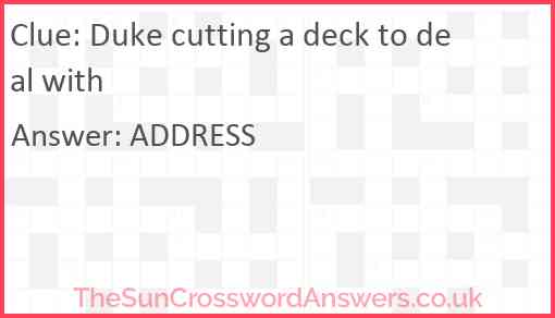 Duke cutting a deck to deal with is a crossword clue for which we have 1 possible answer and we have spotted 2 times in our database. This crossword clue was last seen on 25 November 2024 in The Sun Cryptic Crossword puzzle!