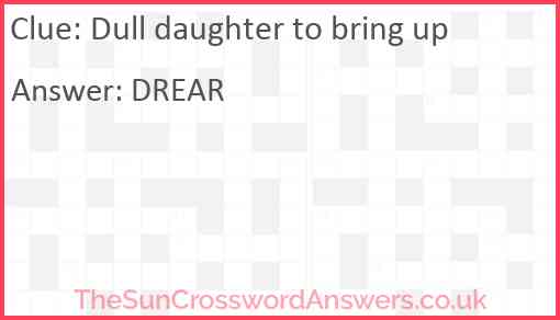 Dull daughter to bring up is a crossword clue for which we have 1 possible answer and we have spotted 3 times in our database. This crossword clue was last seen on 19 March 2025 in The Sun Cryptic Crossword puzzle!