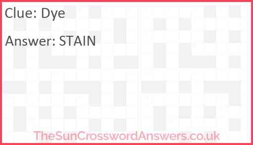 Dye is a crossword clue for which we have 1 possible answer and we have spotted 4 times in our database. This crossword clue was last seen on 18 January 2025 in The Sun Coffee Time Crossword puzzle!