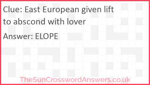 East European given lift to abscond with lover is a crossword clue for which we have 1 possible answer and we have spotted 3 times in our database. This crossword clue was last seen on 13 July 2024 in The Sun Cryptic Crossword puzzle!