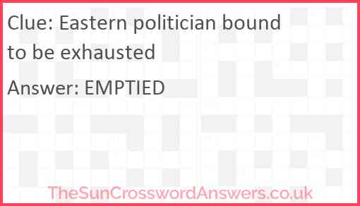 Eastern politician bound to be exhausted is a crossword clue for which we have 1 possible answer and we have spotted 3 times in our database. This crossword clue was last seen on 10 June 2025 in The Sun Cryptic Crossword puzzle!