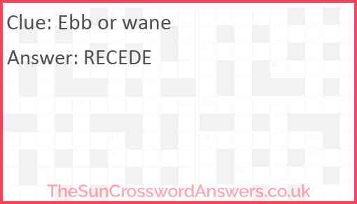 Ebb or wane is a crossword clue for which we have 1 possible answer and we have spotted 4 times in our database. This crossword clue was last seen on 22 July 2025 in The Sun Coffee Time Crossword puzzle!