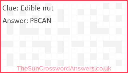 Edible nut is a crossword clue for which we have 1 possible answer and we have spotted 4 times in our database. This crossword clue was last seen on 06 May 2022 in The Sun Coffee Time Crossword puzzle!