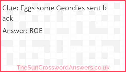 Eggs some Geordies sent back is a crossword clue for which we have 1 possible answer and we have spotted 3 times in our database. This crossword clue was last seen on 14 February 2025 in The Sun Cryptic Crossword puzzle!