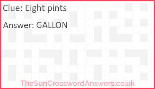 Eight pints is a crossword clue for which we have 1 possible answer and we have spotted 1 times in our database. This crossword clue was last seen on 20 February 2025 in The Sun Coffee Time Crossword puzzle!
