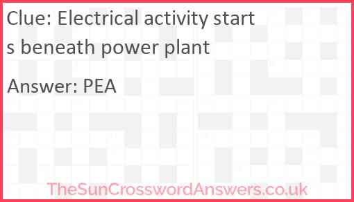 Electrical activity starts beneath power plant is a crossword clue for which we have 1 possible answer and we have spotted 1 times in our database. This crossword clue was last seen on 15 May 2022 in The Sun Cryptic Crossword puzzle!
