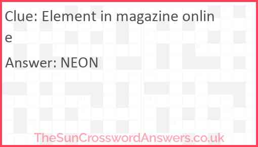 Element in magazine online is a crossword clue for which we have 1 possible answer and we have spotted 2 times in our database. This crossword clue was last seen on 16 December 2023 in The Sun Cryptic Crossword puzzle!