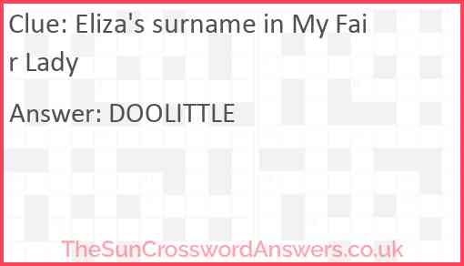 Eliza's surname in My Fair Lady is a crossword clue for which we have 1 possible answer and we have spotted 1 times in our database. This crossword clue was last seen on 09 April 2020 in The Sun Coffee Time Crossword puzzle!
