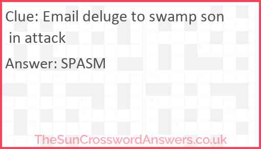 Email deluge to swamp son in attack is a crossword clue for which we have 1 possible answer and we have spotted 2 times in our database. This crossword clue was last seen on 06 October 2024 in The Sun Cryptic Crossword puzzle!