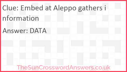 Embed at Aleppo gathers information is a crossword clue for which we have 1 possible answer and we have spotted 1 times in our database. This crossword clue was last seen on 10 April 2024 in The Sun Cryptic Crossword puzzle!