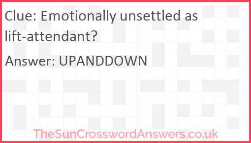 Emotionally unsettled as lift-attendant? is a crossword clue for which we have 1 possible answer and we have spotted 1 times in our database. This crossword clue was last seen on 07 March 2021 in The Sun Cryptic Crossword puzzle!