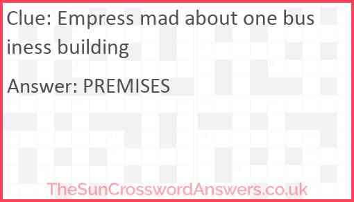 Empress mad about one business building is a crossword clue for which we have 1 possible answer and we have spotted 1 times in our database. This crossword clue was last seen on 10 December 2018 in The Sun Cryptic Crossword puzzle!