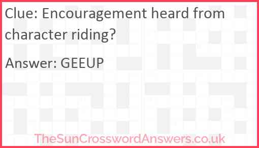 Encouragement heard from character riding? is a crossword clue for which we have 1 possible answer and we have spotted 1 times in our database. This crossword clue was last seen on 13 February 2021 in The Sun Cryptic Crossword puzzle!