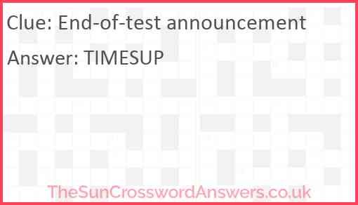 End-of-test announcement is a crossword clue for which we have 1 possible answer and we have spotted 1 times in our database. This crossword clue was last seen on 15 April 2021 in The Sun Coffee Time Crossword puzzle!