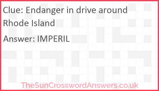 Endanger in drive around Rhode Island is a crossword clue for which we have 1 possible answer and we have spotted 3 times in our database. This crossword clue was last seen on 24 December 2023 in The Sun Cryptic Crossword puzzle!