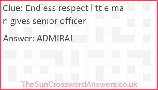 Endless respect little man gives senior officer is a crossword clue for which we have 1 possible answer and we have spotted 1 times in our database. This crossword clue was last seen on 10 June 2024 in The Sun Cryptic Crossword puzzle!