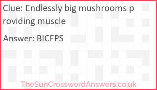 Endlessly big mushrooms providing muscle is a crossword clue for which we have 1 possible answer and we have spotted 2 times in our database. This crossword clue was last seen on 30 September 2024 in The Sun Cryptic Crossword puzzle!