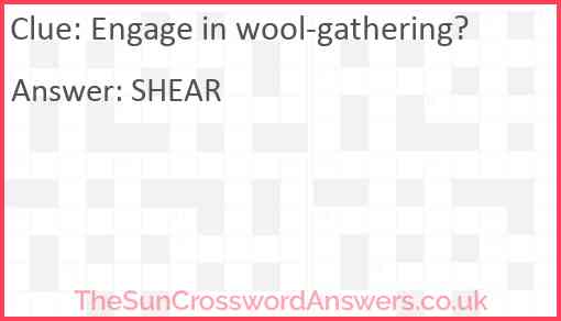 Engage in wool-gathering? is a crossword clue for which we have 1 possible answer and we have spotted 1 times in our database. This crossword clue was last seen on 09 March 2025 in The Sun Cryptic Crossword puzzle!