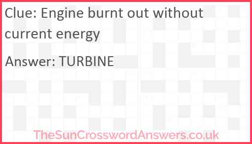 Engine burnt out without current energy is a crossword clue for which we have 1 possible answer and we have spotted 1 times in our database. This crossword clue was last seen on 22 August 2024 in The Sun Cryptic Crossword puzzle!