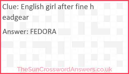 English girl after fine headgear is a crossword clue for which we have 1 possible answer and we have spotted 1 times in our database. This crossword clue was last seen on 08 February 2022 in The Sun Cryptic Crossword puzzle!